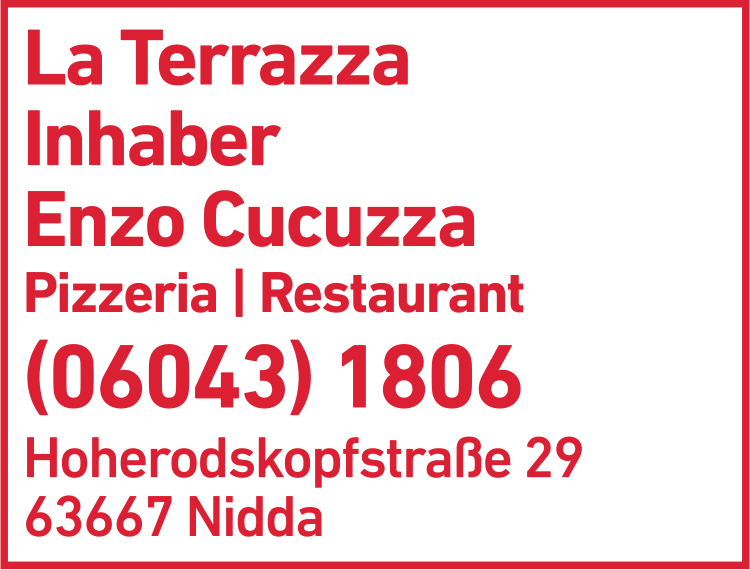 Die Adresse von La Terrazza Ristorante lautet: Hoherodskopfstr. 29, 63667 Nidda