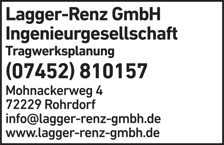 Die Adresse von Lagger-Renz Ingenieurgesellschaft GmbH Tragwerksplanung lautet: Mohnackerweg 4, 72229 Rohrdorf