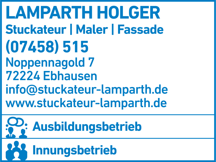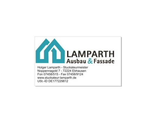 Die Adresse von Lamparth Holger Stuckateurbetrieb lautet: Noppennagold 7, 72224 Ebhausen