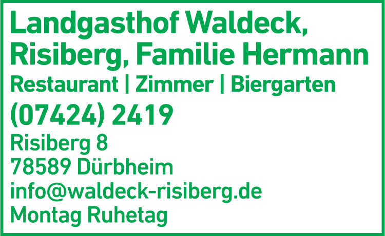 Die Adresse von Landgasthof Waldeck lautet: Risiberg 8, 78589 Dürbheim