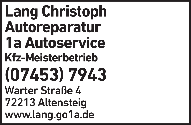 Die Adresse von Lang Christoph 1a Autoservice lautet: Warter Str. 4, 72213 Altensteig