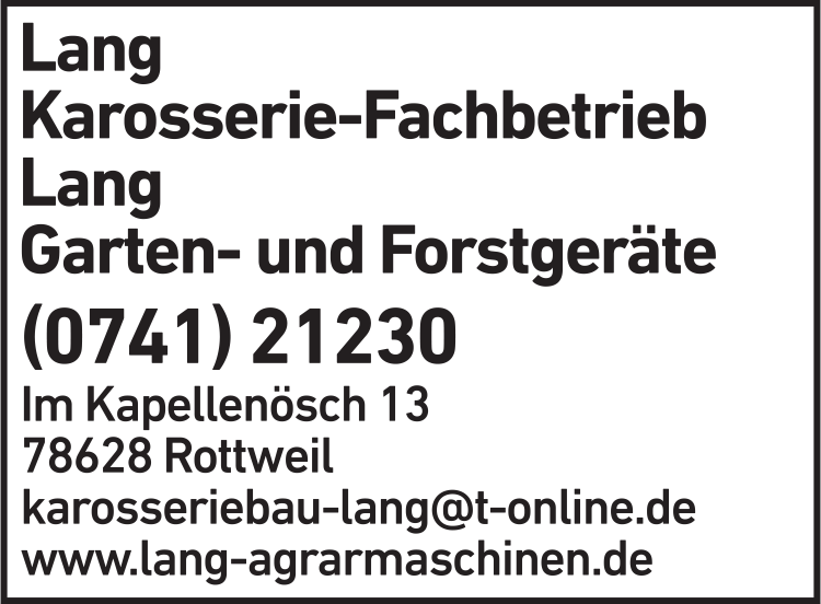 Die Adresse von Lang Ulrich Karosseriebau lautet: Im Kapellenösch 13, 78628 Rottweil