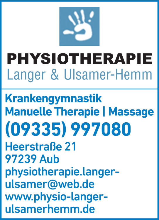 Die Adresse von Langer & Ulsamer-Hemm Physiotherapie lautet: Heerstr. 21, 97239 Aub