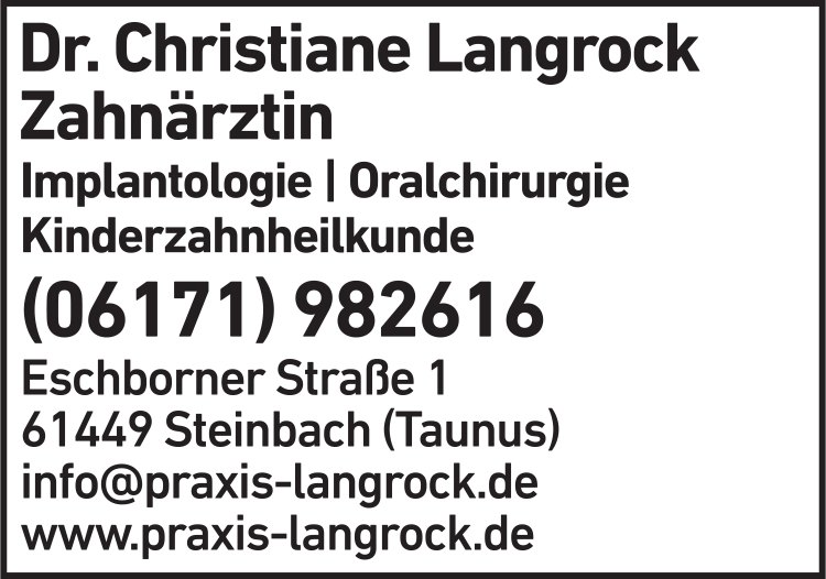 Die Adresse von Langrock Christiane Dr. Zahnärztin lautet: Eschborner Str. 1, 61449 Steinbach (Taunus)