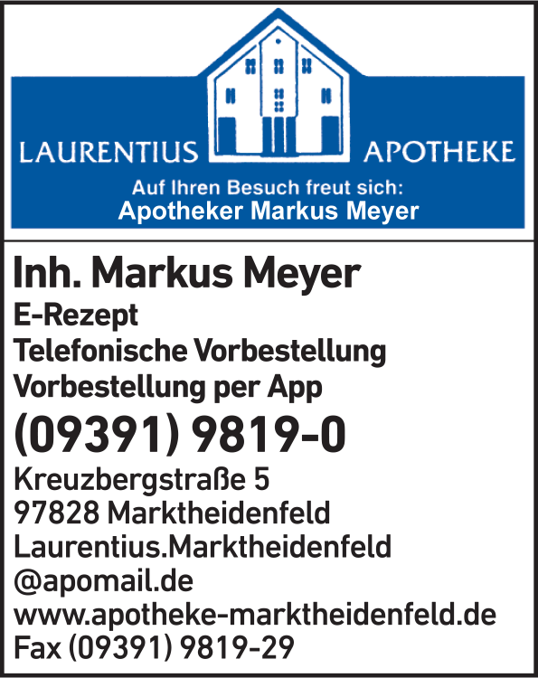 Die Adresse von Laurentius-Apotheke, Inh. Markus Meyer lautet: Kreuzbergstr. 5, 97828 Marktheidenfeld