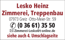Die Adresse von Lesko Heinz Zimmerei lautet: Otto-Meier-Str. 59, 07973 Greiz