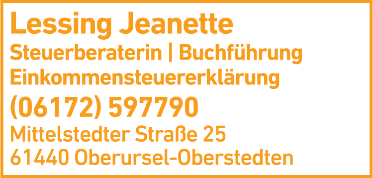 Die Adresse von Lessing Jeanette Dipl. - Betriebsw.(FH) Steuerberaterin lautet: Mittelstedter Str. 25, 61440 Oberursel