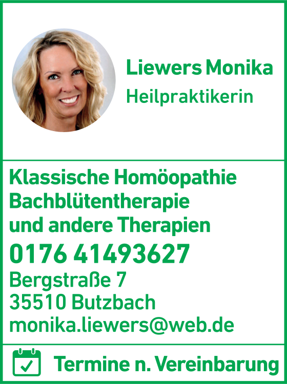 Die Adresse von Liewers Monika Heilpraktikerin lautet: Bergstr. 7, 35510 Butzbach