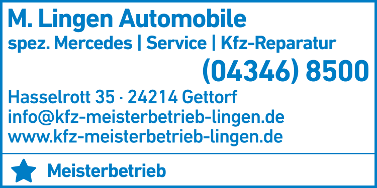 Die Adresse von Lingen M. KFZ-Meister Reparaturwerkstatt lautet: Hasselrott 35, 24214 Gettorf