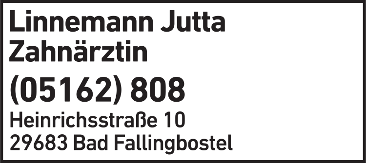 Die Adresse von Linnemann Jutta Zahnarztpraxis lautet: Heinrichsstr. 10, 29683 Bad Fallingbostel