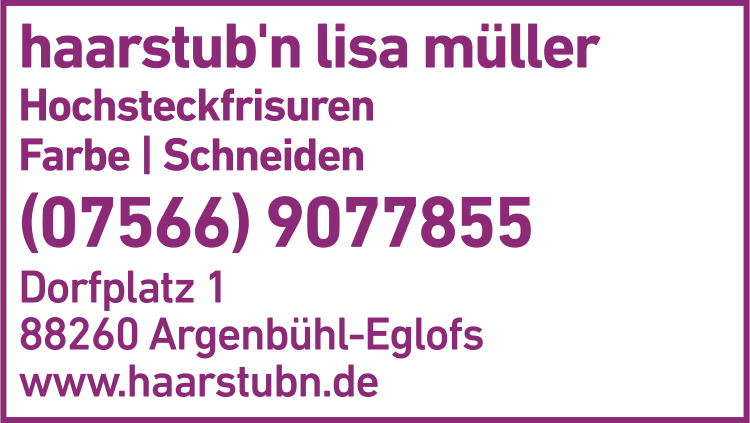 Die Adresse von Lisa Müller Haarstub'n Friseur lautet: Dorfplatz 1, 88260 Argenbühl-Eglofs