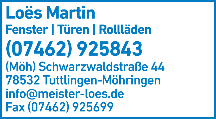 Loés Martin Fenster, Türen, Rollläden 07462 92 58 43 Tuttlingen-Möhringen Schwarzwaldstr. 44 78532 Möhringen