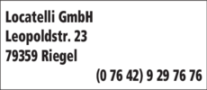 Die Adresse von Locatelli GmbH lautet: Leopoldstr. 23, 79359 Riegel