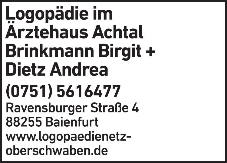 Logopädie im Ärztehaus Achtal Brinkmann Birgit + Dietz Andrea 0751 5 61 64 77 Baienfurt Ravensburger Str. 2 88255 de.teleauskunft.oetb.webapp2.detail.Graphic@7c22d7dc