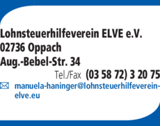 Die Adresse von Lohnsteuerhilfeverein ELVE e.V. lautet: August-Bebel-Str. 34, 02736 Oppach
