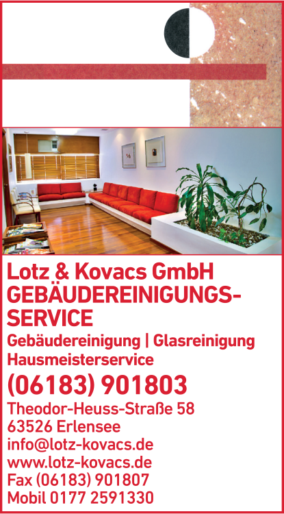 Die Adresse von Lotz & Kovacs GmbH Gebäudereinigung lautet: Theodor-Heuss-Str. 58, 63526 Erlensee