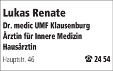 Lukas Renate Dr. medic UMF Klausenburg hat montags von 08:00 - 11:30 Uhr, dienstags von 08:00 - 11:30 Uhr und 16:00 - 18:30 Uhr, mittwochs von 08:00 - 10:00 Uhr, donnerstags von 08:00 - 11:30 Uhr und 16:00 - 18:30 Uhr und freitags von 08:00 - 11:30 Uhr geöffnet.