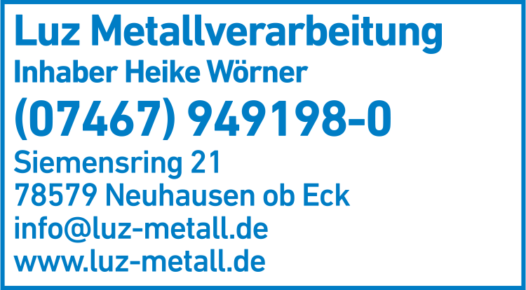 Die Adresse von Luz Metallverarbeitung lautet: Siemens-Ring 21, 78579 Neuhausen