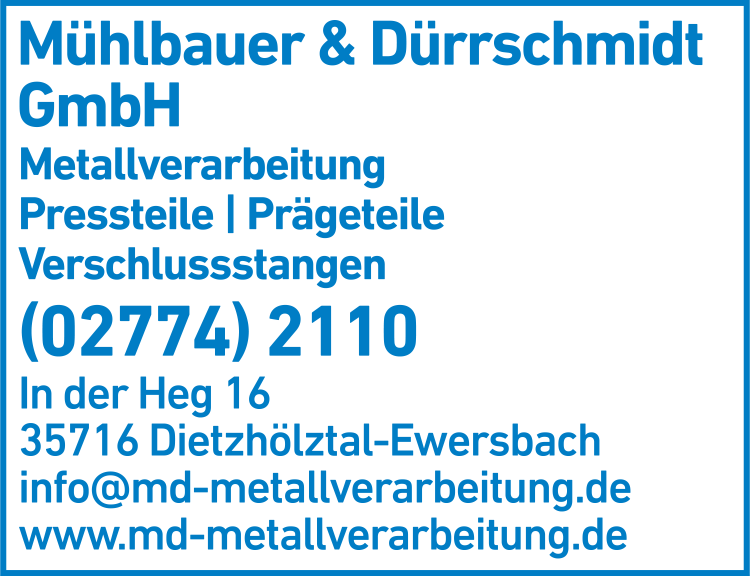 Mühlbauer + Dürrschmidt GmbH Metallverarbeitung 02774 21 10 Dietzhölztal In der Heg 16 35716 Ewersbach