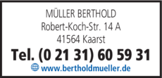 Die Adresse von Müller Berthold lautet: Robert-Koch-Str. 14 A, 41564 Kaarst