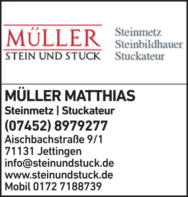 Die Adresse von Müller Matthias Stuckateurbetrieb lautet: Aischbachstr. 9/1, 71131 Jettingen