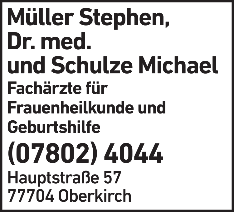 Müller Stephen Dr. med und Schulze Michael Gemeinschaftspraxis für Frauenheilkunde 07802 40 44 Oberkirch Hauptstr. 57 77704 5 5 5
