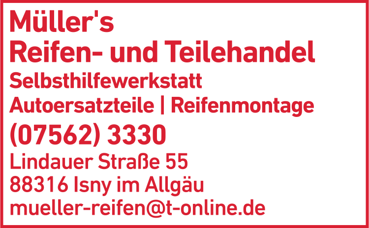 Die Adresse von Müller's Reifen- & Teilehandel lautet: Lindauer Str. 55, 88316 Isny im Allgäu
