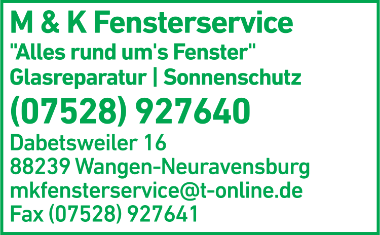 Die Adresse von M & K Fensterservice lautet: Dabetsweiler 16, 88239 Wangen-Neuravensburg