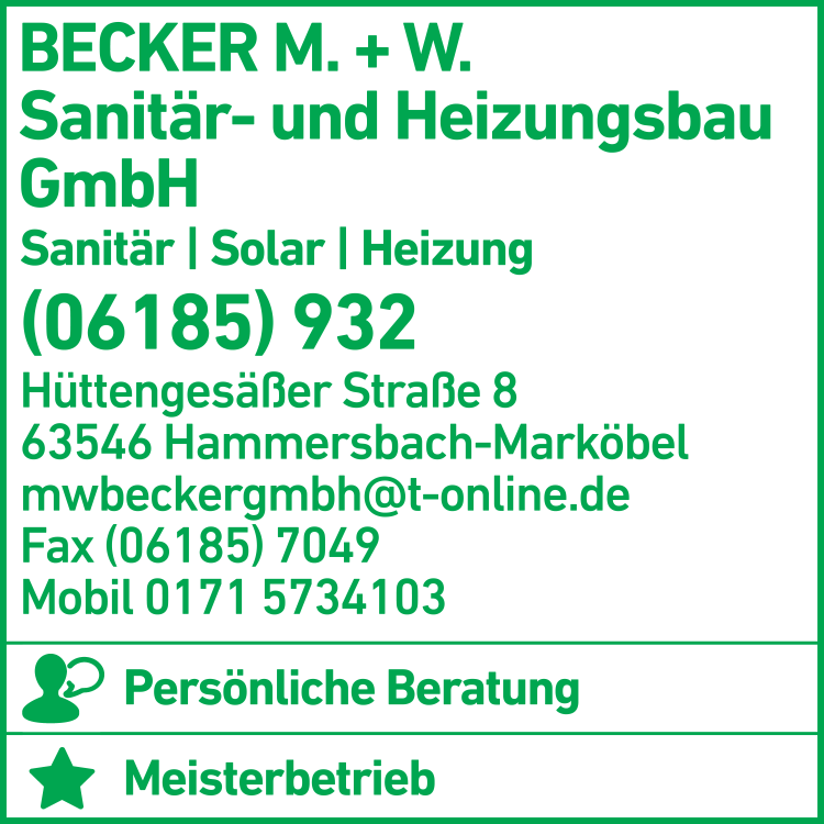 Die Adresse von M. + W. Becker Sanitär Heizungsbau GmbH lautet: Hüttengesäßer Str. 8, 63546 Hammersbach-Marköbel