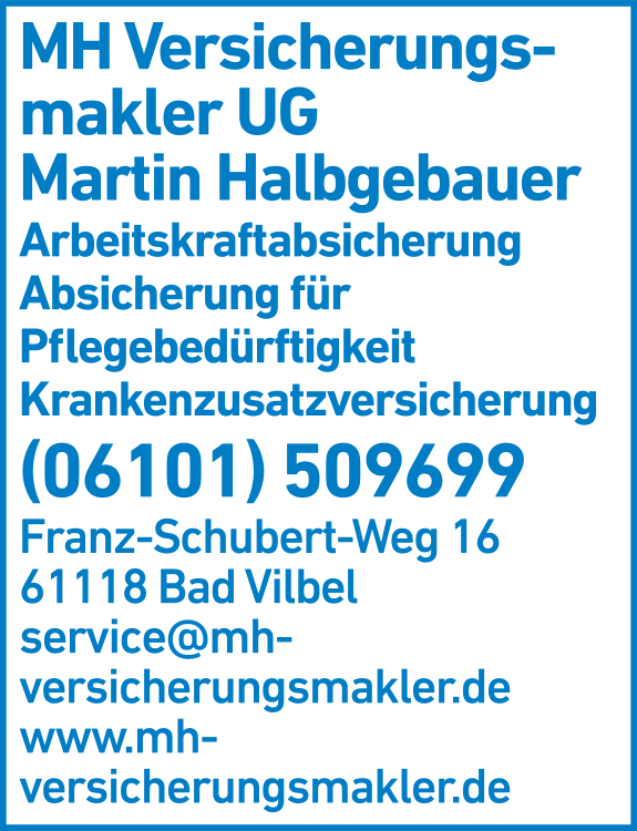 Die Adresse von MH Versicherungsmakler UG, Martin Halbgebauer Versicherungsmakler und Versicherungsagentur lautet: Franz-Schubert-Weg 16, 61118 Bad Vilbel