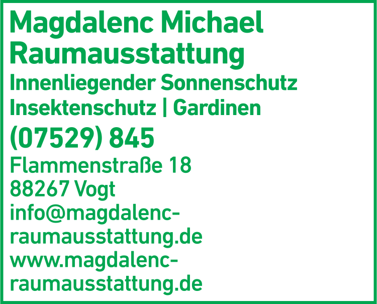Die Adresse von Magdalenc Michael Raumausstatter lautet: Flammenstr. 18, 88267 Vogt