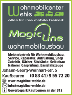 MagicLine - Wehle Wohnmobile nach Maß 08341 9 55 72 20 Kaufbeuren Johann-Georg-Weinhart-Str. 5 87600 Neugablonz https://ies.v4all.de/0122/OETB/0106/6/4476/6894476_200x100px.png