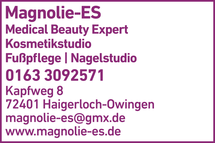 Die Adresse von Magnolie-ES Kosmetikstudio lautet: Kapfweg 8, 72401 Haigerloch-Owingen