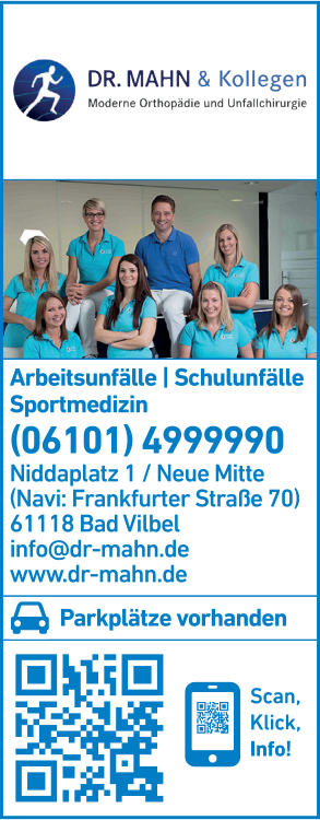 Die Adresse von Mahn Holger Dr. med. Praxis für Orthopädie u. Unfallchirurgie lautet: Niddaplatz 1, 61118 Bad Vilbel