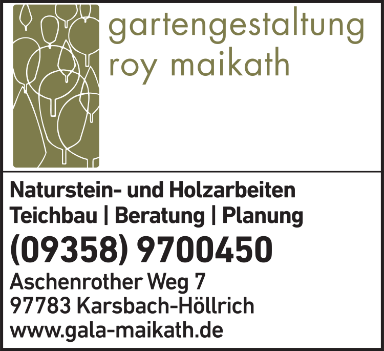 Maikath Roy Gartengestaltung, Gartenlandschaftsbau 09358 9 70 04 50 Karsbach Aschenrother Weg 7 97783 Höllrich