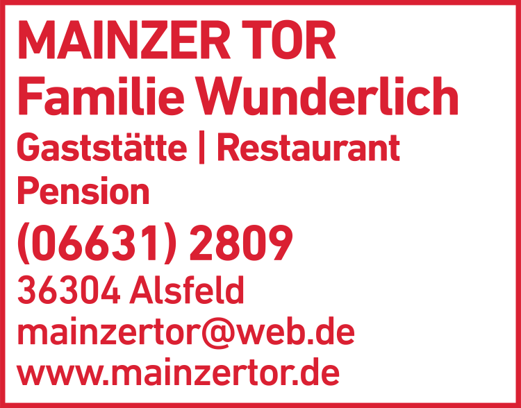 Die Adresse von Mainzer Tor Fam. Wunderlich lautet: Mainzer Tor 13, 36304 Alsfeld
