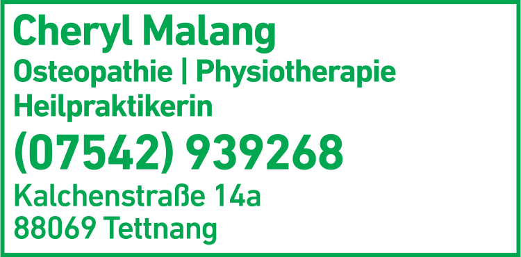 Die Adresse von Malang Cheryl Heilpraktikerin lautet: Kalchenstr. 14 a, 88069 Tettnang