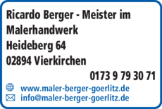 Die Adresse von Maler Berger lautet: Heideberg 64, 02894 Vierkirchen