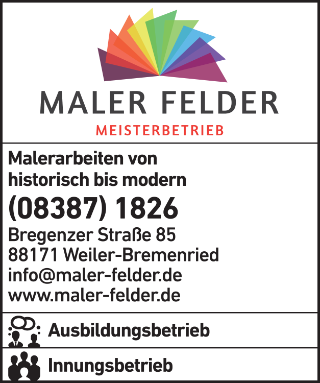 Die Adresse von Maler Felder Malermeister Matthias Müller lautet: Bregenzer Str. 85, 88171 Weiler-Simmerberg