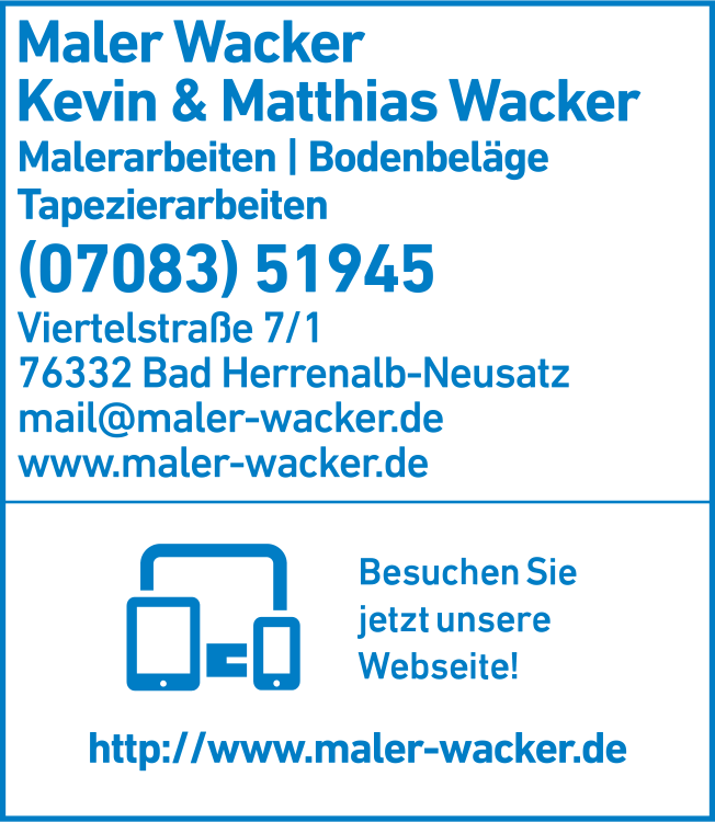 Die Adresse von Maler Wacker lautet: Viertelstr. 7/1, 76332 Bad Herrenalb