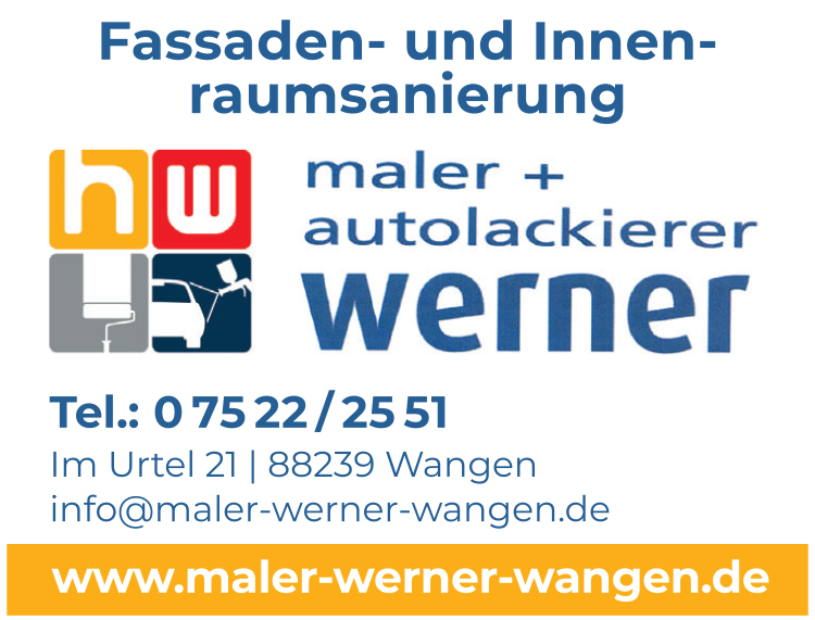 Die Adresse von Maler Werner eGbR, Werner Hansjörg Maler- u. Autolackierbetrieb lautet: Im Urtel 21, 88239 Wangen