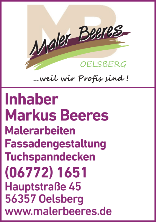 Die Adresse von Malerbetrieb Beeres lautet: Hauptstr. 45, 56357 Oelsberg