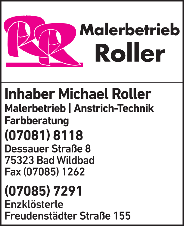 Die Adresse von Malerbetrieb Roller lautet: Dessauer Str. 8, 75323 Bad Wildbad