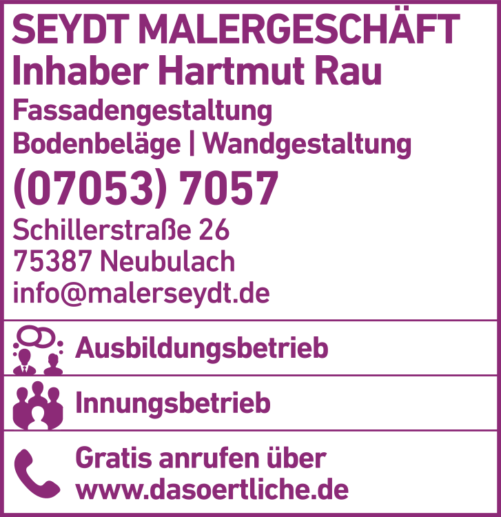 Die Adresse von Malergeschäft Seydt lautet: Schillerstr. 26, 75387 Neubulach