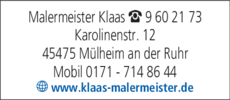 Die Adresse von Malermeister Klaas Volker lautet: Karolinenstr. 12, 45475 Mülheim an der Ruhr