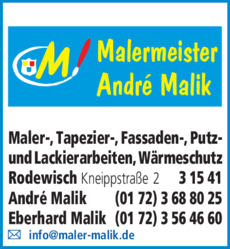 Die Adresse von Malermeister Malik lautet: Kneippstr. 2, 08228 Rodewisch