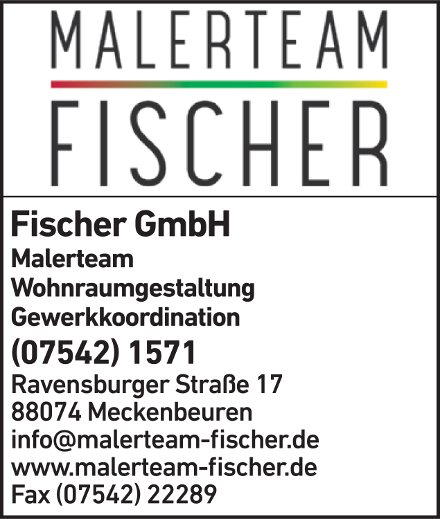 Die Adresse von Malerteam Fischer GmbH lautet: Ravensburger Str. 17, 88074 Meckenbeuren