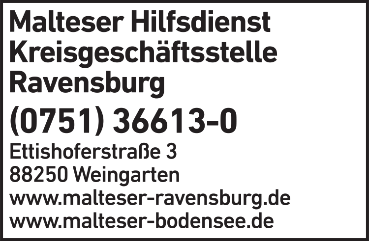 Die Adresse von Malteser Hilfsdienst Kreisgeschäftsstelle lautet: Ettishofer Str. 3, 88250 Weingarten