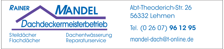Die Adresse von Mandel Rainer Dachdeckerbetrieb lautet: Abt-Theoderich-Str. 26, 56332 Lehmen