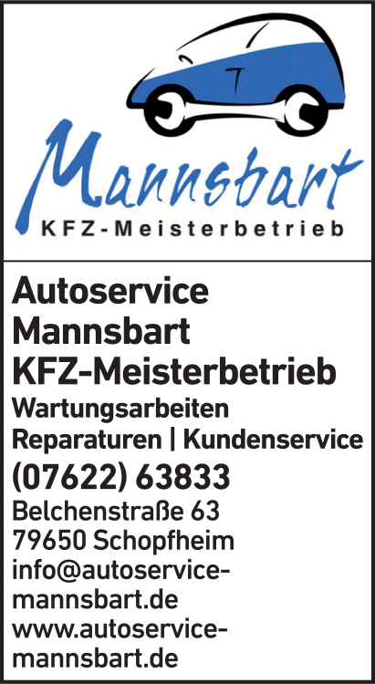Die Adresse von Mannsbart Uwe Autoservice lautet: Belchenstr. 63, 79650 Schopfheim